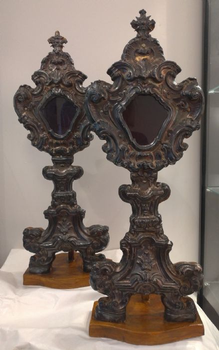 Stupenda coppia di reliquiari in lastra di argento sbalzata su base in legno. Napoli 1763